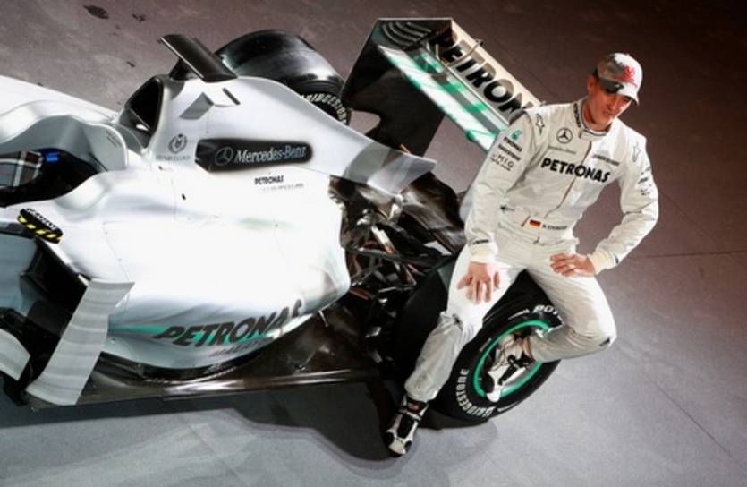 В музее автопроизводителя в немецком Штуттгарте пилоты команды Михаэль Шумахер и Нико Росберг представили цвета болида - с черной носовой частью и бирюзовым блеском в угоду спонсору конюшни - Петронас.