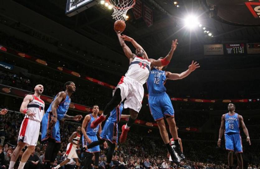 Во время визита в Вашингтон Оклахома была, как говорится, «team to beat», со своей десятиматчевой победной серией и «горячим» Дюрантом. И Колдуны сделали именно это, уверенно обыграв Громовых, причем сделав это весьма уверенно. Уже в первой четверти Уизардс завладели 12-очковым преимуществом, чему причиной были две вещи: неудачный старт Дюранта (2/7 в первой четверти) и ужасный контроль мяча гостями (10 потерь за первые 12 минут). Конечно, класс Тандер не позволил хозяевам расслабляться – уже во второй четверти 10 очков Дюранта сократили отставание всего до одного очка, однако подопечные Уиттмэна устояли. Решающим отрезком матча стал конец третьей четверти. После трехочкового Фишера гости в очередной раз подошли на расстояние в одно очко, на что Уолл и компания ответили рывком 20-7. Сам Уолл во время этого рывка набрал 6 очков и отдал 5 передач.