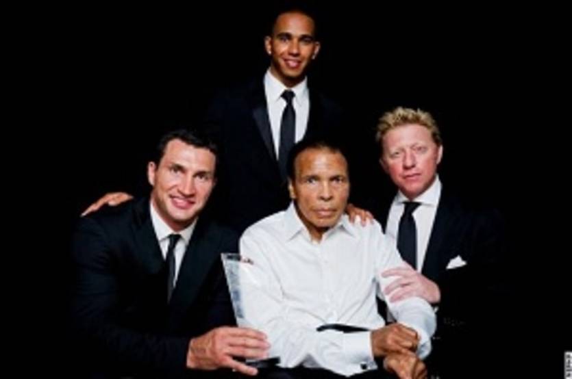 С 70-летней легендой бокса, Олимпийским чемпионом 1960-го года, на фотографии запечатлены Олимпийский чемпион Атланты Владимир Кличко, чемпион мира Формулы 1 2008-го года британец Льюис Хэмилтон, а также легендарный теннисист Борис Беккер.