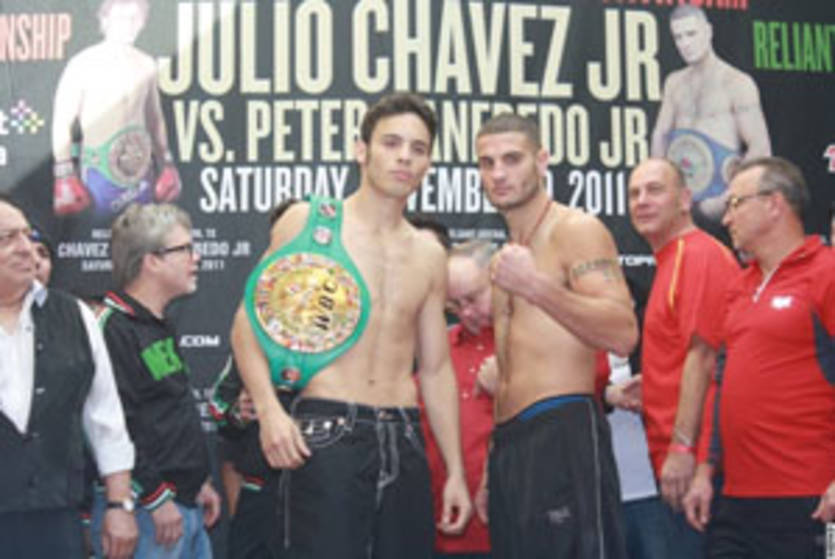 Состоялась обязательная процедура взвешивания участников вечера бокса в Хьюстоне, центральным поединком которого станет встреча за титул чемпиона мира WBC в среднем весе между его обладателем Хулио Сезаром Чавесом-младшим и Питером Манфредо-младшим.