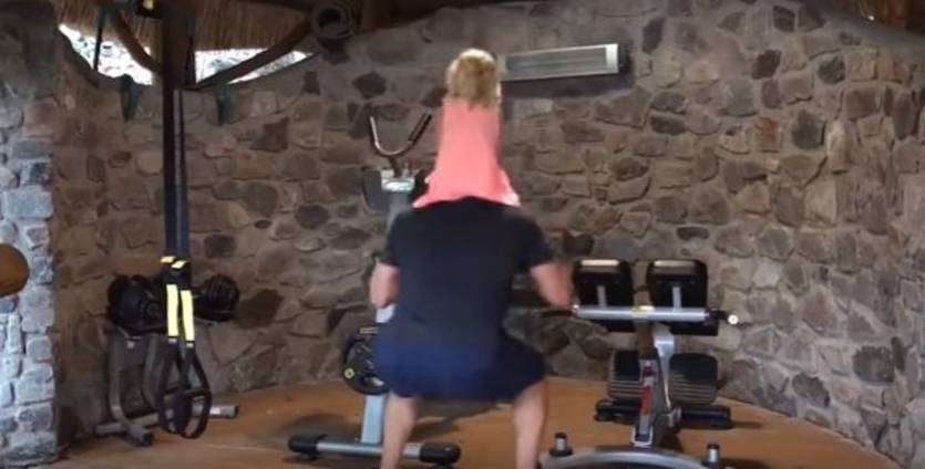 В сети появилось видео, на котором Владимир тренируется со своей дочкой Кайей-Евдокией. Боксер усадил девочку на плечи и приседает.