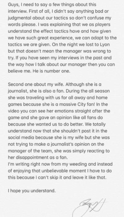 Она выразила свое мнение, как это делают и другие фанаты. Но она хотела только сделать нас лучше. Мы понимаем, что она не должна была постить это в социальных сетях, потому что она – моя жена. Но она не пыталась высказать журналистское мнение о тренере, она просто выразила разочарование, как болельщица.