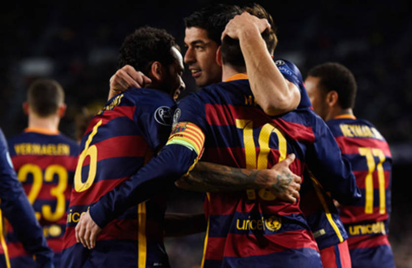 Голы: Суарес, 15, 44, Месси, 18, 60, Пике, 56, Адриано, 77 - Джеко, 90+1