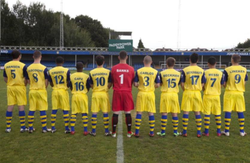 Весь состав команды получил футболки с фамилиями легендарных игроков прошлого и настоящего. Так, отныне в составе ФК Фарнборо играют Марадона, Пеле, Зидан, Месси и многие другие.