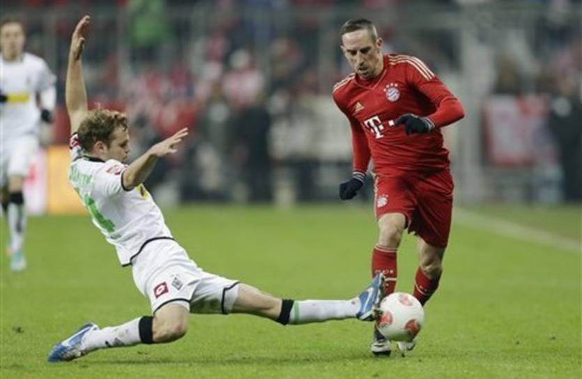 С первых минут Бавария ринулась в атаку в то время как соперник окопался в защите. Очень глубоко сели гладбахцы, но мюнхенцы терпеливо выискивали щели в защите гостей. Одну такую на 6 минуте нашел франк Рибери, который неудержимо пронесся по флангу, обыграл Штранцля и пробил с острого угла, но тер Штеген был на чеку. Не так уж много моментов создала Бавария, в большинстве случаев Жеребята действовали уверенно. Боруссия тем временем помышляла не только о защите. И когда Гладбах нашел возможность ужалить, то сделал это крайне удачно. Удар Толги Чигерчи с линии штрафной приняла на себя рука неудачливого Боатенга и судья назначил пенальти. Маркс был хладнокровен и точен. Бавария ответила тем, что начала жестко встречать гостей в противоборствах. Активнее всех, как и обычно в итаких ситауциях, действовал Франк Рибери. Его хлесткий удар с 20-ти метров в классном стиле парировал тер Штеген. Спустя минуту Херрманн прошел с мячом к краю штрафной, в то время как Нойер зачем-то вышел из ворот, но удару Майка не хватило силы и точности. Бавария давила, но, как не раз уже в этом сезоне случалось, не могла вскрыть организованную оборону соперника, сбиваясь на фланговые подачи.