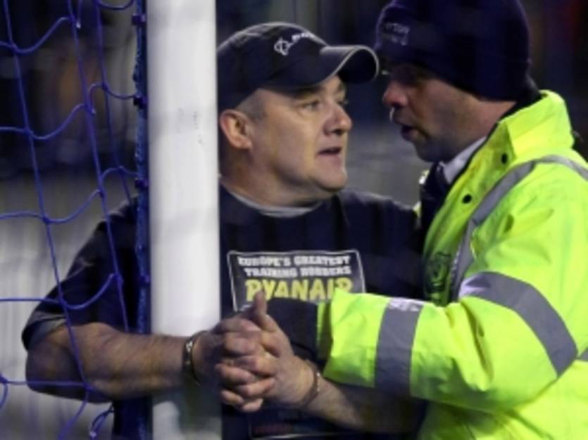 46-летний Джон Джозеф Фоули был арестован британской полицией за то, что за несколько минут до завершения первого тайма поединка между Эвертоном и Манчестер Сити выбежал на поле и приковал себя наручниками к воротам, которые защищал Джо Харт.
