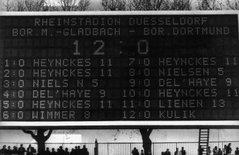 Кельн удвоил преимущество в своем матче. Это не остановило менхенгладбахцев, и когда забивал Кристиан Кулик, на табло были заполнены все ряды для обозначения авторов голов. Жеребцы довели счет до 12:0 в свою пользу, и этот результат и по сей день остается наибольшей победой в истории Бундеслиги...