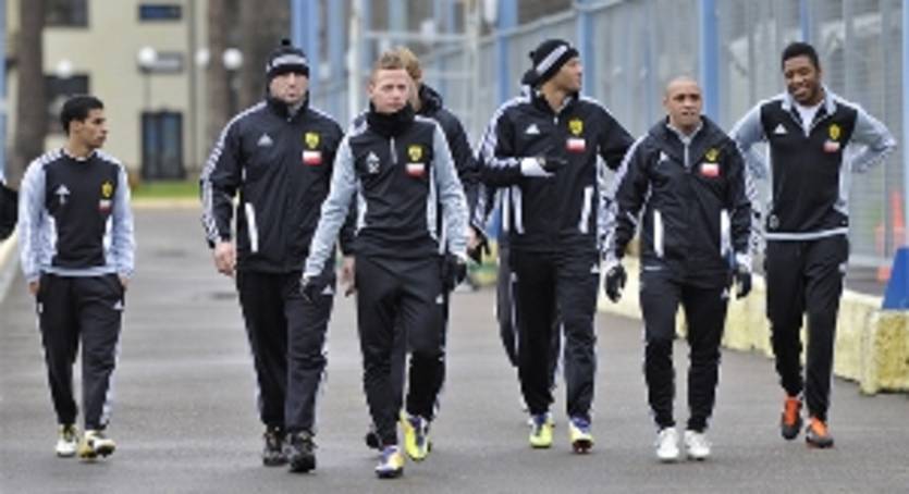 Впервые в сезоне команда провела разминку в зале – футболисты около 15 минут играли в гандбол. После занятий внутри комплекса команда переместилась на поле, где продолжила тренировку.