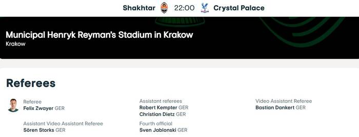 УЕФА назначил рефери, которые будут работать на первом полуфинальном матче Лиги конференций между Шахтером и Кристал Пэлас.