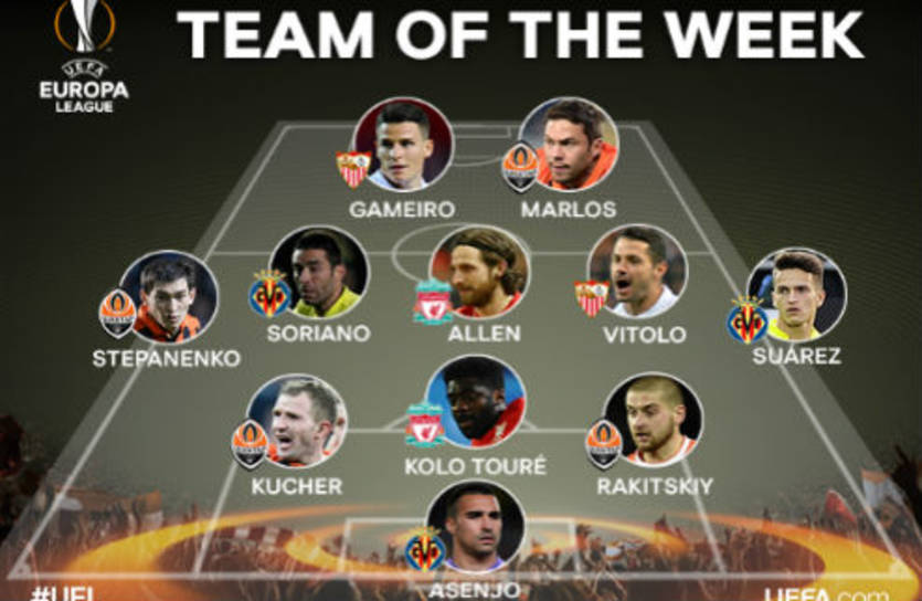 Полузащитники: Тарас Степаненко (Шахтер), Бруно Сориано (Вильярреал), Джо Аллен (Ливерпуль), Витоло (Севилья), Денис Суарес (Вильярреал)