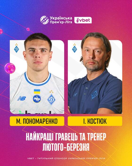 Нападающий Динамо Матвей Пономаренко и наставник киевской команды Игорь Костюк были признаны лучшими игроком и тренером украинской Премьер-лиги в феврале-марте.