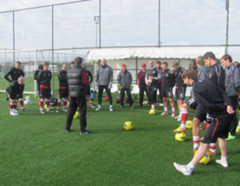 Началось тренировочное занятие с пробежки. Затем с игроками занимался тренер по физподготовке Игорь Касьяненко, который провёл с ребятами основательную разминку. После этого, футболисты были разбиты на две группы и отрабатывали различные упражнения. Завершилась тренировка серьёзной беговой работой.