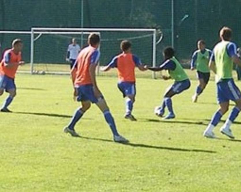 Вечером футболисты провели двухсторонку, состоявшую из трех таймов по 10 минут каждый. С самого начала было понятно, что предстоит тяжелая борьба, в которой никто не захочет уступать. Два первых тайма прошли без забитых мячей. Соперники лишь обменялись опасными моментами. Сначала Шовковский ногами парировал удар Шевченко с нескольких метров, замыкавшего прострел Нинковича с левого фланга, а вскоре "зеленые" требовали пенальти за нарушение правил против Кравца, но Валерий Зуев, выполнявший функции сурового арбитра, остался непреклонен.