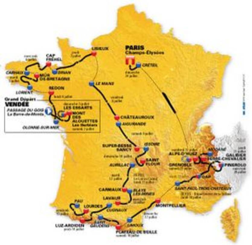 Тур де Франс стартует на острове Нуармутье, а финиширует на Елисейских полях в Париже. Некоторые этапы пройдут на территории соседней Италии.