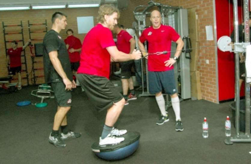 Для удобства количественно увеличившийся личный состав разделен на две группы. Меняясь местами, "миникоманды" выполняют тестовые упражнения на велотренажерах, позволяющие тренерскому штабу определить текущее физическое состояние подопечных, и работают в тренажерном зале, где для команды запланированы занятия тяжелой атлетикой и специфические упражнения на укрепление устойчивости, координации движений и ловкости.