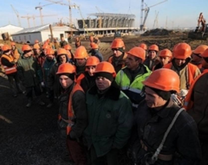 Рабочие, которые вышли за пределы стадиона, рассказали журналистам, что сегодня им обещали выплатить зарплату, однако такие обещания они слышат уже не впервые.