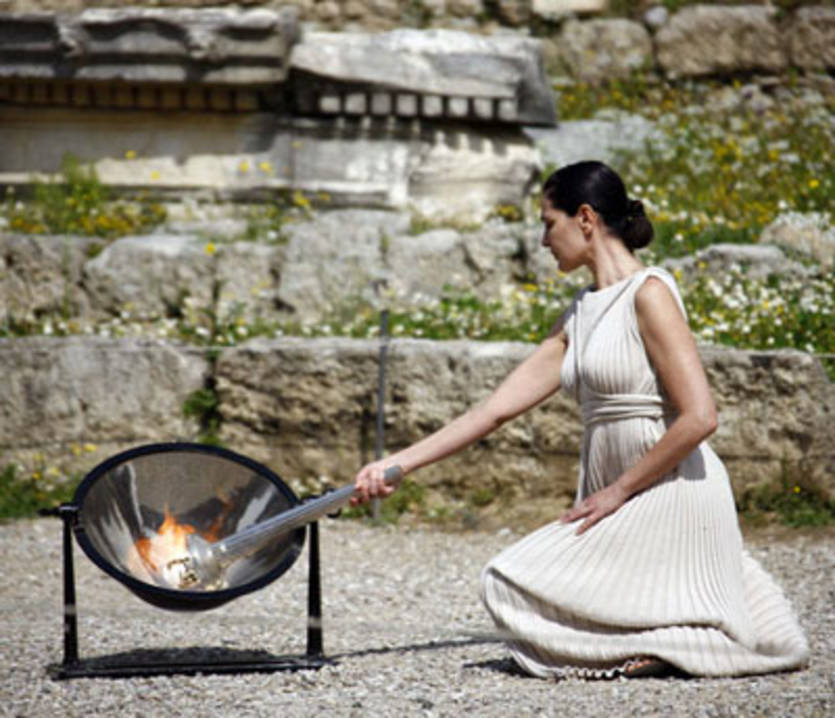 Во время репетиции можно было увидеть стоящую перед 2600-летним храмом богини Геры актрису, одетую как древняя жрица с вогнутым зеркалом в руках для того, чтобы зажечь серебряный факел от лучей солнца.