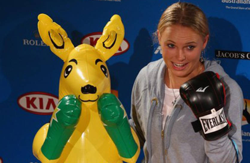 Каролин Возняцки становится весьма интересной персоной не только на корте, но и за его пределами. На послематчевую пресс-конференцию она сегодня пришла с кенгуру и парой боксерских перчаток, извинившись перед журналистами за свою шутку, в которой она заявила, что была недавно атакована этим мирным животным в Мельбурне.