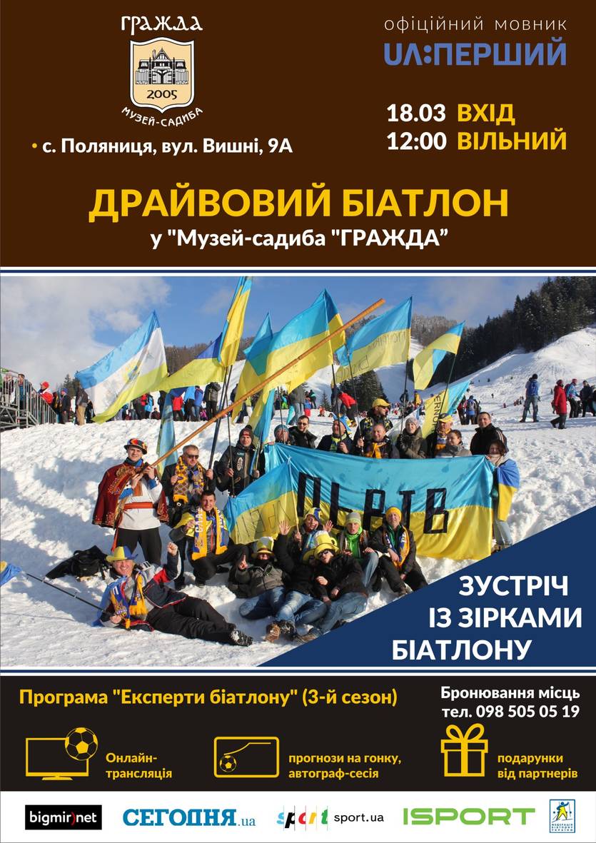 В воскресенье, 18 марта, в 12:00 в "Музее-усадьбе" Гражда "(Ивано-Франковская область, с. Поляница, ул. Вишни, 9А,) в рамках социального проекта "Эксперты биатлона-3" болельщики посмотрят женскую гонку преследования и мужскую эстафету 8-го этапа Кубка мира в норвежском Холменколлене. Компанию любителям биатлона составят звезды украинского биатлона.